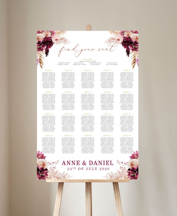 Tags: blush, blush and burgundy, blush pink, bohemian, boho, floral, gold and blush, romantic, table plan