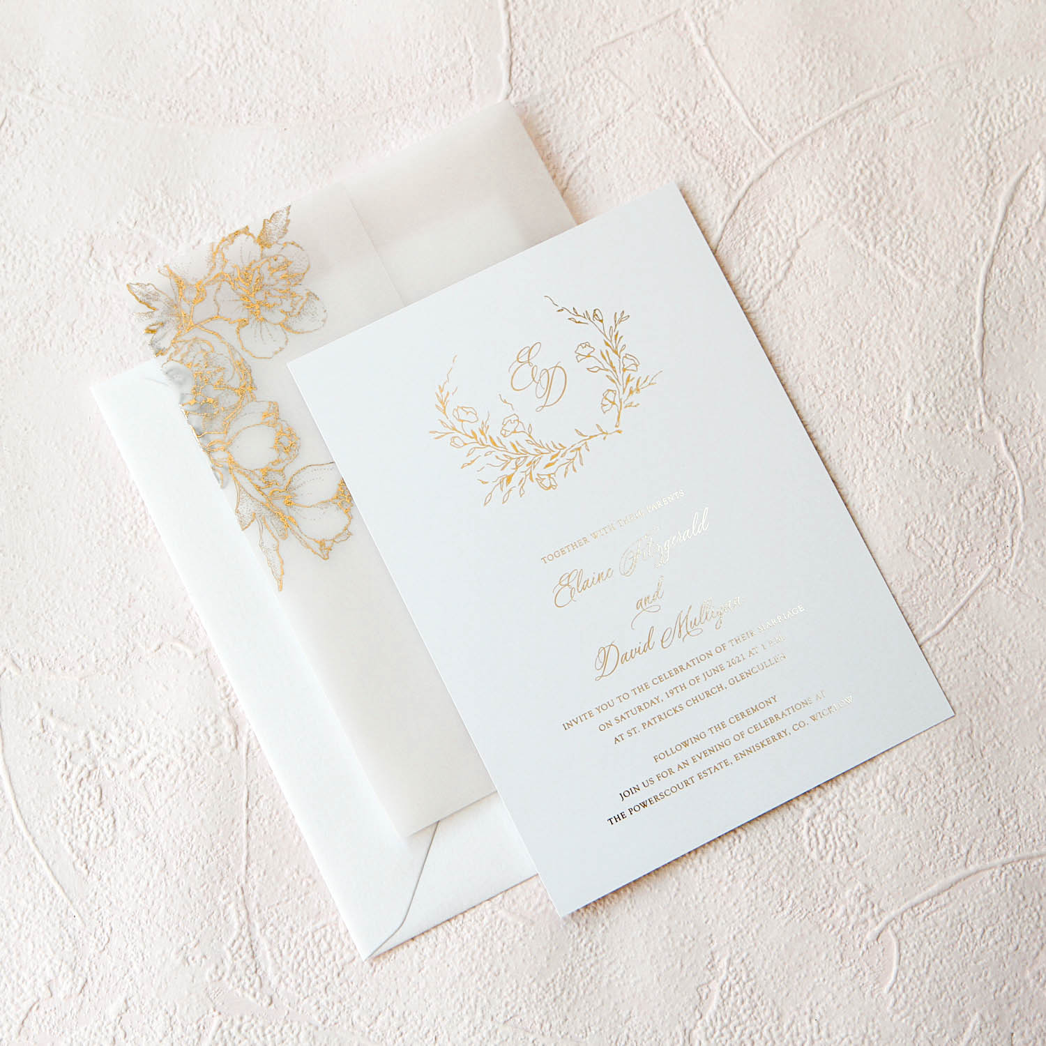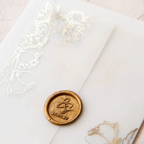 Dreamy transparent wedding invitation, made from superior quality vellum paper and with gold foil flowers, speciality print. The wrap is secured with a wax seal, made with your very own monogram (additional charges apply). Various colours available, including white, copper, rose gold etc.
