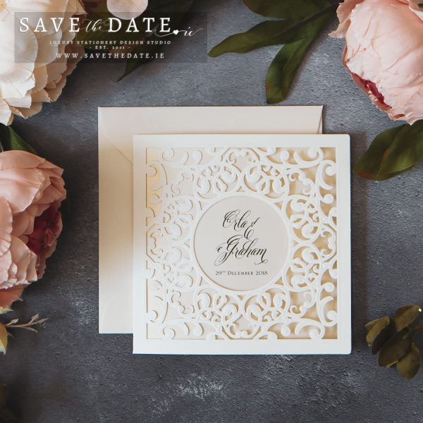 A beautiful and delicate invitation. The cover is laser cut with a delicate scroll motif and the insert is made from a luxurious pearlescent paper (120gsm). The insert comes in a wide range of colours, including gold-leaf, cream, black, gold or any other colours. White printing can be done on darker shades of paper (white print on navy insert for example).