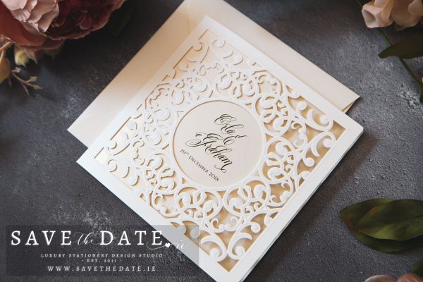 Square laser cut ivory and light gold invitation